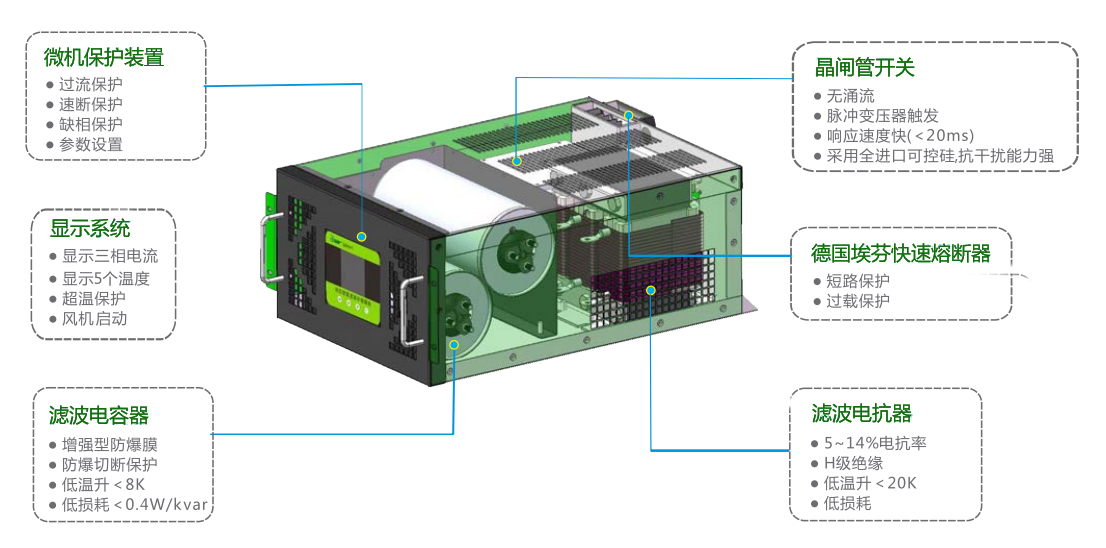 安全可靠:匹配高性能電力電容器和串聯(lián)電抗器,體積小、重量輕、高品質(zhì)、低溫升、低功耗、壽命長,從而保證了整機的安全性和可靠性。